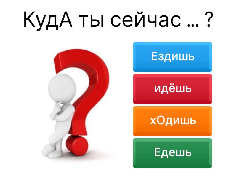 1) КудА ты сейчас ... ? a) Ездишь b) идёшь c) хОдишь d) Едешь 2) Я ... в школу каждый день. a) хожу́ b) Ездишь c) Еду d) идУ 3) Он сейчас ... на машине к друзьям. a) идёт b) ХОдит c) Едет d) Ездит 4) Нина и Ирина ... на станцию метро. a) ХОдит b) Ездит c) Едут d) идУт 5) Мальчик ... на велосипеде. a) ХОдит b) идёт c) Едет d) Ездит 6) Мы сейча́с ... на рынок. a) ХОдим b) Ездим c) Едем d) идём 7) Куда зАвтра он ... отдыхать? a) Идёт b) Едет c) ХОдит d) Ездит 8) Куда вы ... в о́тпуск этим летом? a) Ездите b) Едешь c) ХОдите d) Едете 9) Мы любим ... в Испанию на машине. a) идтИ b) Ездить c) ходИть d) Ехать 10) - КудА вы сейчАс ... ? - В кино́. a) идёте b) идтИ c) хОдите d) Ездишь  11) Я не люблЮ _______ на автОбусе a) идтИ b) ХодИть c) Ездить d) Ехать 12) Мы чАсто ________ в цЕнтр a) Едем b) ХОдим c) Идём d) Ездим 13) ЛЕна ненавИдит _______ за гранИцу a) ХодИть b) Едет c) ИдтИ d) Ездить