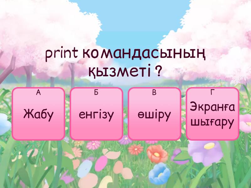 1) print командасының қызметі ? a) Жабу b) енгізу c) өшіру d) Экранға шығару 2) input командасының қызметі ? a) өшіру b) Мәліметтерді енгізу c) жабу d) шығару 3) int қандай тип? a) логикалық b) бүтін c) нақты d) мәтіндік 4) Салыстыру белілері a) > < b) == c) <, >, <= ,>=, == d) + * \ % 5) Python-да көбейту таңбасы a) + b) * c) - d) = 6) Қалдықпен бөлу таңбасы a) % b) // c) / d) *