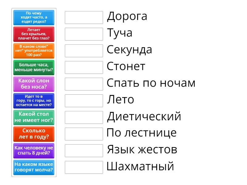 Летает без крыльев, плачет без глаз? - Лето, Больше часа, меньше минуты? - Шахматный, На каком языке говорят молча? - Стонет, По чему ходят часто, а ездят редко? - Спать по ночам, Идет то в гору, то с горы, но остается на месте? - Диетический, Какой стол не имеет ног? - Дорога, Как человеку не спать 8 дней? - По лестнице, В каком слове" нет" употребляется 100 раз? - Язык жестов, Какой слон без носа? - Секунда, Сколько лет в году? - Туча,