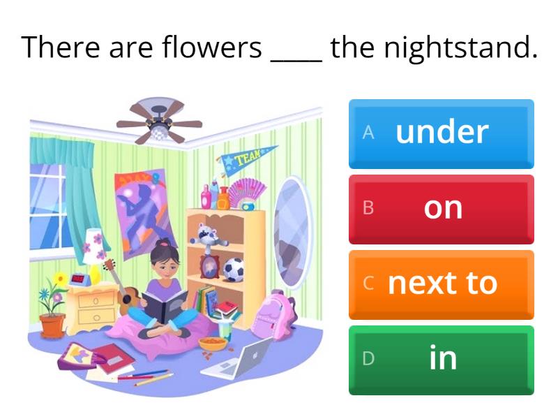 1) There are flowers ____ the nightstand. a) under b) on c) next to d) in 2) There is a poster ____ the girl. a) in front of b) behind c) on d) opposite 3) There are pens ____ the girl. a) behind b) between c) under d) in front of 4) There is a bag ____ the mirror. a) in front of b) next to c) under d) behind 5) There is a girl ____ the pillow. a) on b) under c) in d) next to 6) There is a pillow ____ the nightstand and the bookcase. a) next to b) between c) in d) in front of 7) There is a laptop ____ the carpet. a) next to b) behind c) under d) on