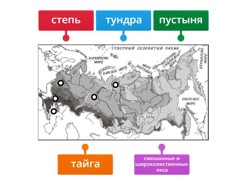 тундра, степь, тайга, пустыня, смешанные и широколиственные леса.