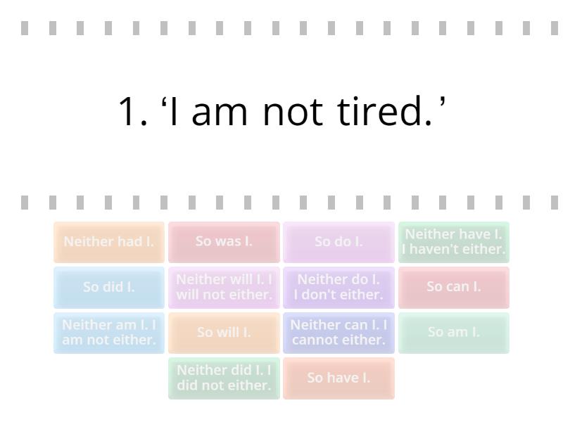 Neither am I. I am not either. - 1. ‘I am not tired.’, So was I. - 2. ‘I was late.’ , So will I. - 3. ‘I will go to the cinema.’ , Neither did I. I did not either. - 4. ‘I did not finish it.’, So do I. - 5. ‘I like coffee.’ , Neither can I. I cannot either. - 6. ‘I can't swim.’ , So am I. - 7. ‘I’m staying for another two days.’ , So have I. - 8. ‘She has received a degree in physics.’ , Neither do I. I don't either. - 9. ‘I don’t have his number.’ , So did I. - 10. ‘I found the problem very hard.’ , So can I. - 11. Mark can draw beautifully. , Neither had I. - 12. ‘I had never seen so much food in my life.’ , Neither have I. I haven't either. - 13. I haven't played the new PS 5 yet., Neither will I. I will not either. - 14 . I will not be an architect.,