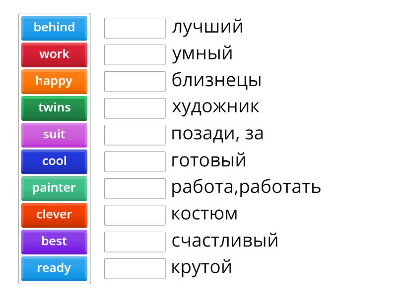 work - работа,работать, ready - готовый, best - лучший, cool - крутой, suit - костюм, clever - умный, happy - счастливый, twins - близнецы, painter - художник, behind - позади, за,