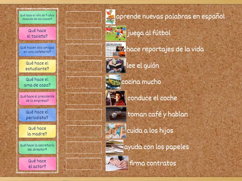 Qué hace el presidente de la empresa? - firma contratos, Qué hace el actor? - lee el guión , Qué hace la secretaria del director? - ayuda con los papeles, Qué hace el ama de casa? - cocina mucho , Qué hace el niño de 9 años después de las clases? - juega al fútbol, Qué hace el periodista? - hace reportajes de la vida, Qué hace la madre? - cuida a los hijos, Qué hacen dos amigas en una cafetería? - toman café y hablan , Qué hace el estudiante? - aprende nuevas palabras en español, Qué hace el taxista? - conduce el coche,