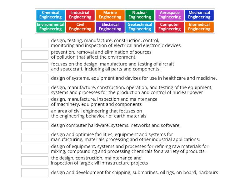 Geotechnical Engineering - an area of civil engineering that focuses on the engineering behaviour of earth materials, Marine Engineering - design and development for shipping, submarines, oil rigs, on-board, harbours, Environmental Engineering - prevention, removal and elimination of sources of pollution that affect the environment., Industrial Engineering - design and optimise facilities, equipment and systems for manufacturing, materials processing and other industrial applications., Computer Engineering - design computer hardware, systems, networks and software., Chemical Engineering - design of equipment, systems and processes for refining raw materials for mixing, compounding and processing chemicals for a variety of products., Biomedical Engineering - design of systems, equipment and devices for use in healthcare and medicine., Nuclear Engineering - design, manufacture, construction, operation, and testing of the equipment, systems and processes for the production and control of nuclear power, Aerospace Engineering - focuses on the design, manufacture and testing of aircraft and spacecraft, including all parts and components., Civil Engineering - the design, construction, maintenance and inspection of large civil infrastructure projects, Electrical Engineering - design, testing, manufacture, construction, control, monitoring and inspection of electrical and electronic devices, Mechanical Engineering - design, manufacture, inspection and maintenance of machinery, equipment and components,