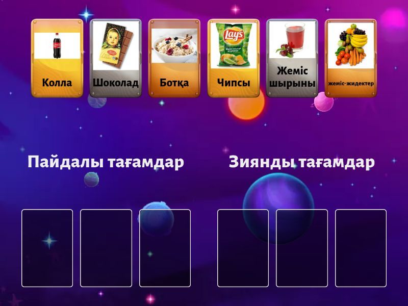 Пайдалы тағамдар: Ботқа, Жеміс шырыны, жеміс-жидектер, Зиянды тағамдар: Колла, Чипсы, Шоколад,