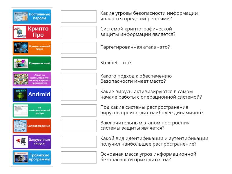 Троянские программы - Основная масса угроз информационной безопасности приходится на?, Постоянные пароли - Какой вид идентификации и аутентификации получил наибольшее распространение?, Android - Под какие системы распространение вирусов происходит наиболее динамично?, Сопровождение - Заключительным этапом построения системы защиты является?, Не авторизованный доступ - Какие угрозы безопасности информации являются преднамеренными?, Комплексный - Какого подход к обеспечению безопасности имеет место?, Крипто Про - Системой криптографической защиты информации является?, Загрузочные вирусы - Какие вирусы активизируются в самом начале работы с операционной системой?, Промышленный вирус - Stuxnet - это?, Атака на компьютерную систему крупного предприятия - Таргетированная атака - это?,