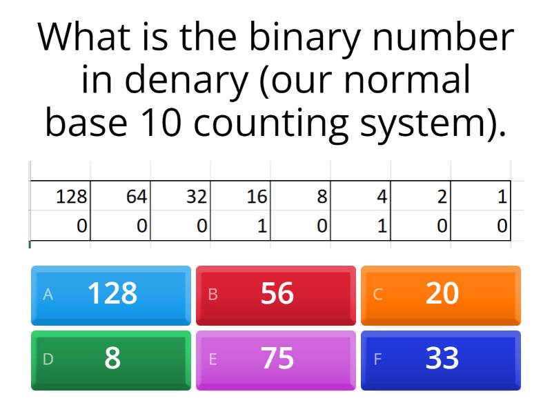 1) What is the binary number in denary (our normal base 10 counting system). a) 128 b) 56 c) 20 d) 8 e) 75 f) 33 2) What is the binary number in denary (our normal base 10 counting system). a) 128 b) 56 c) 20 d) 8 e) 75 f) 33 3) What is the binary number in denary (our normal base 10 counting system). a) 128 b) 56 c) 20 d) 8 e) 75 f) 33 4) What is the binary number in denary (our normal base 10 counting system). a) 128 b) 56 c) 20 d) 8 e) 75 f) 33 5) What is the binary number in denary (our normal base 10 counting system). a) 128 b) 56 c) 20 d) 8 e) 75 f) 33 6) What is the binary number in denary (our normal base 10 counting system). a) 128 b) 56 c) 20 d) 8 e) 75 f) 33 7) Convert 5 into binary a) 00000101 b) 00000111 c) 00010111 d) 00010110 e) 11100110 f) 11101110 8) Convert 22 into binary a) 00000101 b) 00000111 c) 00010111 d) 00010110 e) 11100110 f) 11101110 9) Convert 7 into binary a) 00000101 b) 00000111 c) 00010111 d) 00010110 e) 11100110 f) 11101110 10) Convert 230 into binary a) 00000101 b) 00000111 c) 00010111 d) 00010110 e) 11100110 f) 11101110 11) Convert 23 into binary a) 00000101 b) 00000111 c) 00010111 d) 00010110 e) 11100110 f) 11101110 12) Convert 238 into binary a) 00000101 b) 00000111 c) 00010111 d) 00010110 e) 11100110 f) 11101110 13) From the following, which is the smallest unit of data? a) bit b) byte c) kilobyte d) megabyte e) gigabyte f) terabyte 14) From the following, which is the largest unit of data? a) bit b) byte c) kilobyte d) megabyte e) gigabyte f) terabyte 15) From the following, which is equivalent to eight bits? a) bit b) byte c) kilobyte d) megabyte e) gigabyte f) terabyte 16) From the following, which is equivalent to one million bytes? a) bit b) byte c) kilobyte d) megabyte e) gigabyte f) terabyte 17) From the following, which is equivalent to one thousand bytes? a) bit b) byte c) kilobyte d) megabyte e) gigabyte f) terabyte 18) From the following, which is equivalent to one billion bytes? a) bit b) byte c) kilobyte d) megabyte e) gigabyte f) terabyte