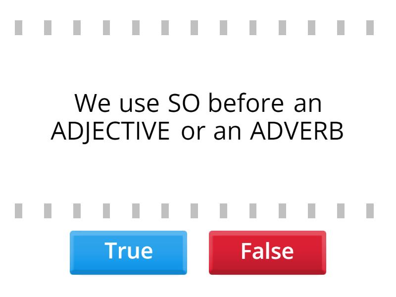 True: We use SO before an ADJECTIVE or an ADVERB, We use SO before such words as LITTLE,FEW,MUCH,MANY, It's correct to say "I've got such a lot of time that I don't know what to do with it". , MUCH and LITTLE are used with UNCOUNTABLE nouns , It's correct to say "There is FAR TOO MUCH crime in the area", If we use SO/SUCH, we can continue with a RESULT sentence which begins with THAT: I have SO many friends THAT I can't remember all of them. , False: We use SO before a NOUN or a VERB, We use SUCH before an ADJECTIVE or an ADVERB, FEW and MANY are used with UNCOUNTABLE nouns, There is no difference in the sense between LITTLE and A LITTLE, It's correct to say "So little people came tothe party that I had to cancel it".,