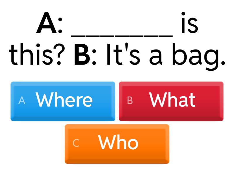 1) A: _______ is this? B: It's a bag. a) Where b) What c) Who 2) A: _______is this? B: It's Maria. She is my sister. a) Where b) What c) Who 3) A: ______is your favourite colour? B: It's blue. a) Who b) Where c) What 4) A: _______ is my brother? B: He is in the park. a) What b) Where c) Who 5) A: _______ do you live? B: I live in Russia. a) What b) Where c) Why 6) ... is breakfast? It is at 9.00 a.m. a) where b) when 7) ....is the flight to New York? It is at 4.30 p.m. a) Who b) When 8) ...my son? He is at school. a) when b) where c) who