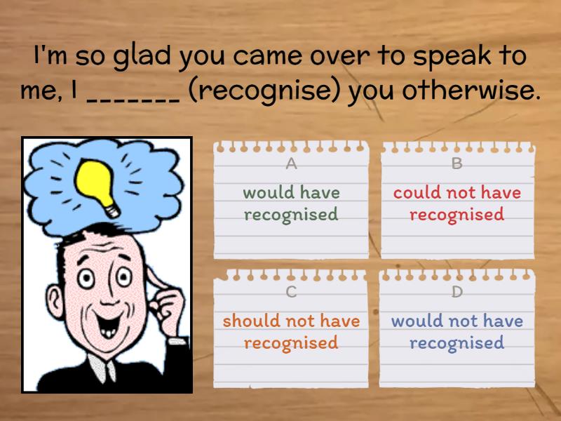 1) I ____________ (call) you, I'm sorry. a) should have called b) would have called c) could have called 2) You must be really glad that you came. You ______ (meet) so many new business contacts if you hadn't come.  a) would have met b) should not have met c) would not have met d) could not have met  e) should have met 3) I _____ (help) you if you had asked me because I had the information. a) would have helped b) could have helped c) could not have helped d) should have helped e) should not have helped 4) I'm so glad you came over to speak to me, I _______ (recognise) you otherwise. a) would have recognised b) could not have recognised c) should not have recognised d) would not have recognised 5) The meeting went really well. In fact, it ________ (go) better. a) should not have gone b) could not have gone c) could have gone d) would not have gone 6) You ________ (say) that in the meeting, because now they will give all the work to us. a) should have said b) would not have said c) should not have said d) could not have said 7) I ________ (tell) you about it sooner, but I have only just found out myself. a) would have told b) would not have told c) could have told d) should have told 8) When I was young, I ________ (be) a professional dancer, but I wanted to do other things with my life. a) would have been b) should have been c) could not have been d) could have been