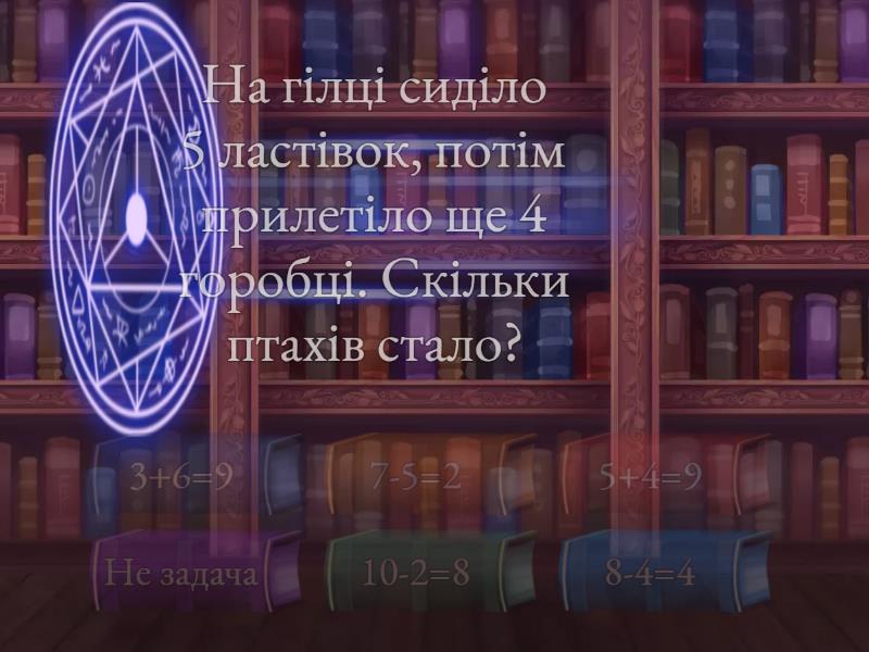 5+4=9 - На гілці сиділо 5 ластівок, потім прилетіло ще 4 горобці. Скільки птахів стало?, 10-2=8 - На столі лежало 10 цукерок. Оленка з'їла 2 цукерки. Скільки цукерок залишилося?, 7-5=2 - У Сергійка є 5 машинок, а у Олега - 7. На скільки машинок у Олега більше ніж у Сергійка?, 3+6=9 - У магазині є 3 груші, а яблук на 6 більше. Скільки яблук у магазині?, 8-4=4 - У Марини є 8 ляльок, а у Катрусі на 4 менше. Скільки ляльок у Катрусі?, Не задача - У садку розквітло 5 тюльпанів і 5 троянд. Всього 10 квіток у садку.,
