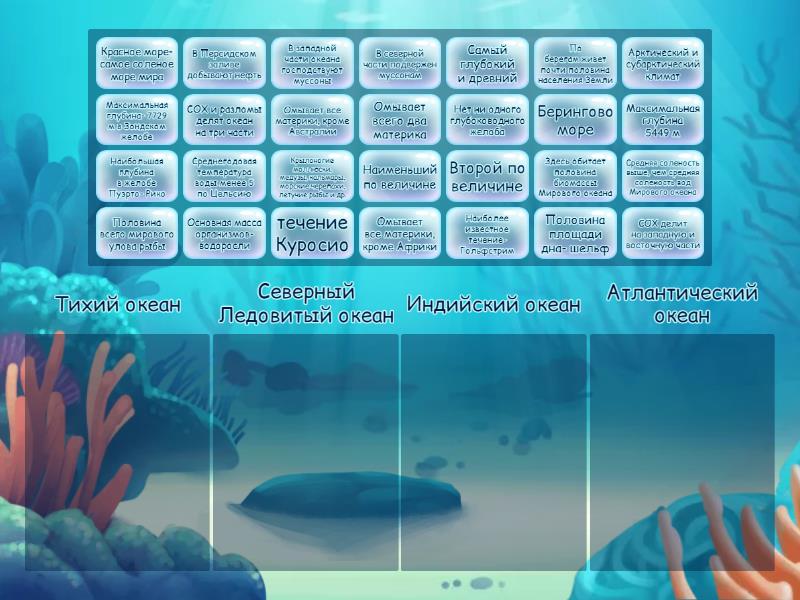 Тихий океан: Самый глубокий и древний, Здесь обитает половина биомассы Мирового океана , По берегам живет почти половина населения Земли, течение Куросио, Берингово море, В западной части океана господствуют муссоны, Омывает все материки, кроме Африки, Северный Ледовитый океан: Наименьший по величине, Омывает всего два материка, Максимальная глубина 5449 м, Арктический и субарктический климат, Основная масса организмов- водоросли, Половина площади дна- шельф, Нет ни одного глубоководного желоба, Среднегодовая температура воды менее 5 по Цельсию, Индийский океан: Максимальная глубина- 7729 м в Зондском желобе, СОХ и разломы делят океан на три части, В северной части подвержен муссонам, Красное море- самое соленое море мира, Крылоногие моллюски, медузы, кальмары, морские черепахи, летучие рыбы и др. , В Персидском заливе добывают нефть, Атлантический океан: Второй по величине, Наиболее известное течение- Гольфстрим, Средняя соленость выше, чем средняя соленость вод Мирового океана, СОХ делит на западную и восточную части, Половина всего мирового улова рыбы , Омывает все материки, кроме Австралии, Наибольшая глубина в желобе Пуэрто- Рико,