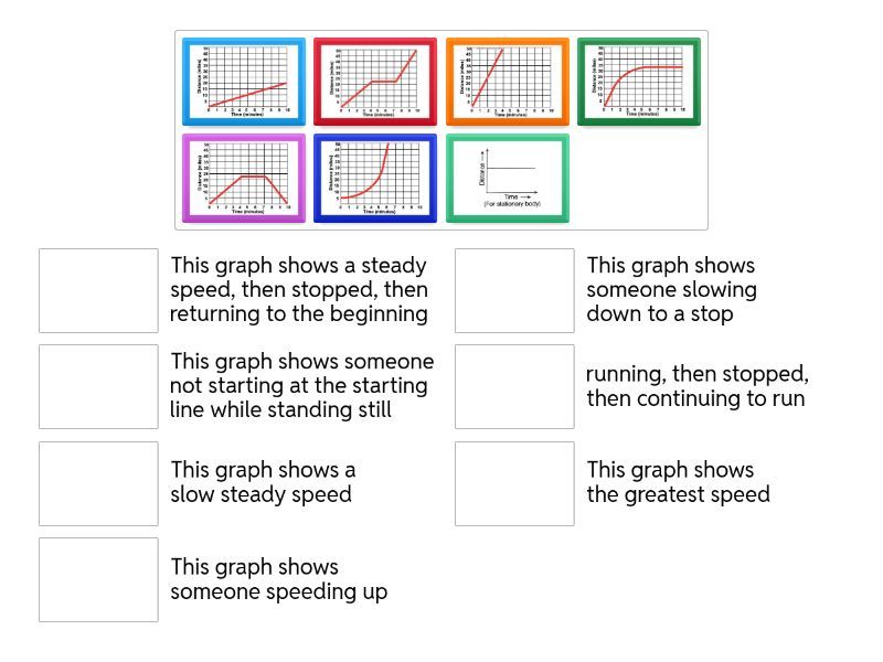 This graph shows the greatest speed, This graph shows a slow steady speed, This graph shows a steady speed, then stopped, then returning to the beginning, This graph shows someone slowing down to a stop, This graph shows someone speeding up, This graph shows someone not starting at the starting line while standing still, running, then stopped, then continuing to run,