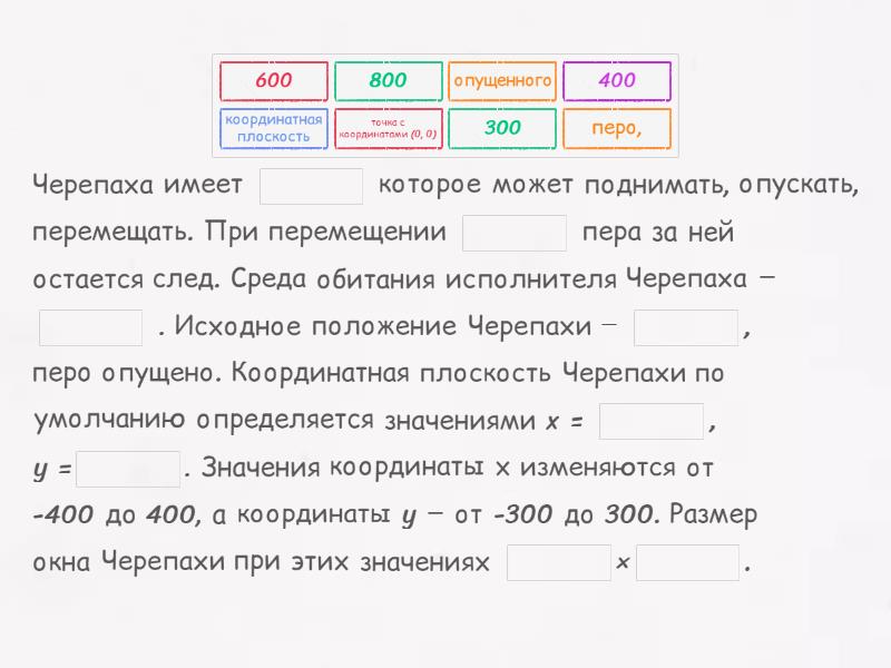 Черепаха имеет ____ которое может поднимать, опускать, перемещать. При перемещении ____ пера за ней остается след. Среда обитания исполнителя Черепаха – ____ . Исходное положение Черепахи – ____, перо опущено. Координатная плоскость Черепахи по умолчанию определяется значениями x = ____, y =____. Значения координаты х изменяются от -400 до 400, а координаты y – от -300 до 300. Размер окна Черепахи при этих значениях ____×____. Программа состоит из отдельных ____. В одной строке можно написать только ____ команду. Если программа не сохранена перед выполнением, то среда предложит ее ____. Выполняться может только ____ программа.
