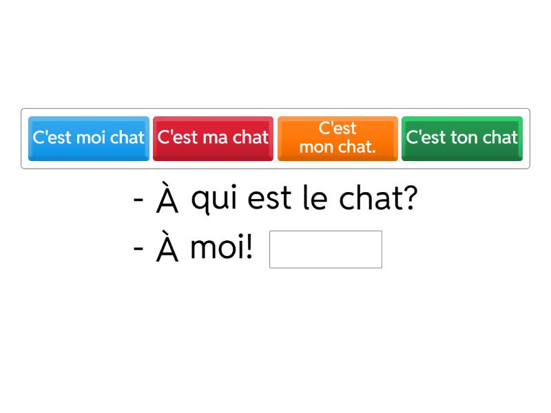 - À qui est le chat? - À moi! ____ - Regardez la maison! C'est la maison de Nicolas. ____ Tu cherches le crayon? ____ Maman apporte les bottes à Pierre. ____ - dit Pierre. Vous cherchez ____? Elle est derrière la maison. Nous avons un chat. ____. Les enfants jouent ____. ____ n'est pas méchant .