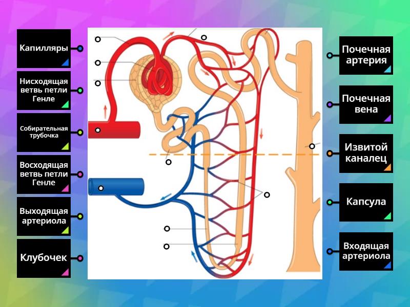Капсула, Клубочек, Входящая артериола, Выходящая артериола, Почечная артерия, Почечная вена, Извитой каналец, Нисходящая ветвь петли Генле, Восходящая ветвь петли Генле, Капилляры, Собирательная трубочка.
