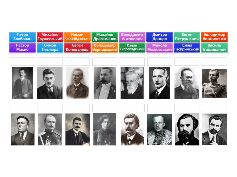 Володимир Вернадський, Володимир Винниченко, Євген Петрушевич, Симон Петлюра, Павло Скоропадський, Нестор Махно, Петро Болбочан, Микола Міхновський, Михайло Грушевський, Номан Челебіджіхан, Дмитро Донцов, Василь Вишиваний, Ісмаїл Гаспринський, Володимир Антонович, Євген Коновалець, Михайло Драгоманов,