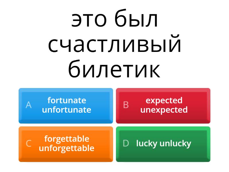 1) это был счастливый билетик a) fortunate unfortunate b) expected  unexpected c) forgettable unforgettable d) lucky unlucky 2) Она была веселая   a) pleasant unpleasant b) friendly unfriendly c) lucky unlucky d) happy unhappy 3) Мы купили обычный торт a) forgettable unforgettable b) pleasant unpleasant c) usual unusual d) lucky unlucky 4) Это был незабываемый день a) lucky unlucky b) fortunate unfortunate c) happy unhappy d) forgettable unforgettable 5) Это был приятный сюрприз a) pleasant unpleasant b) fair unfair c) usual unusual d) forgettable unforgettable 6) Это был несчастливый билетик a) fortunate unfortunate b) pleasant unpleasant c) lucky unlucky d) usual unusual 7) Это было нечестно a) pleasant unpleasant b) forgettable unforgettable c) fair unfair d) lucky unlucky 8) Это был неожиданный подарок a) friendly unfriendly b) fortunate unfortunate c) happy unhappy d) expected  unexpected 9) Она была очень недружелюбной a) usual unusual b) friendly unfriendly c) lucky unlucky d) pleasant unpleasant