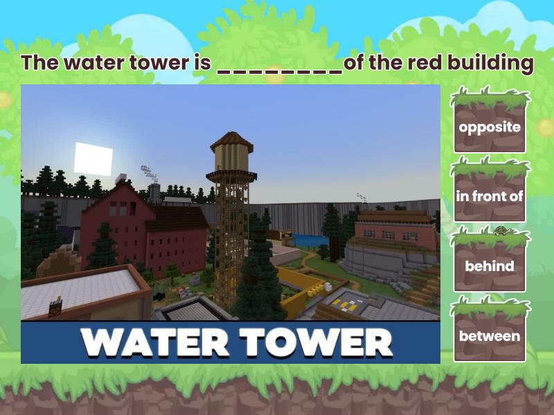 1) A small lake is ________ of the red houses a) in front of b) opposite c) next to d) between e) behind 2) The bakery is __________ the blue building a) in front of b) opposite c) next to d) between e) behind 3) The stadium is _______to the Academy a) behind b) between c) next to d) in front of e) opposite 4) The boy is _________Hogwarts a) opposite b) in front of c) behind d) next to e) between 5) The forest is ________ the Mystery shack a) in front of b) behind c) between d) opposite 6) The red factory is ________ two brown buildings a) opposite b) in front of c) between d) behind 7) The restaurant is ________ a) opposite b) on your right c) on your left d) between 8) The National Library is _________ the blocks of flats (многоквартирные дома) a) in front of b) opposite c) behind d) between 9) The gnomes are ________of the tree a) opposite b) in front of c) behind d) between e) next to 10) The central park in New York is _______ the tall buildings a) opposite b) in front of c) next to  d) between e) behind 11) Wirt (the boy) is ________of the house a) next to b) in front of c) behind d) between e) opposite 12) The hook (крюк) is _________of Maui a) between b) opposite c) next to d) in front of e) behind 13) The brown house is ________the yellow house and a green house a) in front of b) behind c) between d) opposite e) on the right f) next to 14) The water tower is ________of the red building a) opposite b) in front of c) behind d) between 15) The spirit (дух) is ________the boy a) behind b) next to c) opposite d) between e) in front of 16) The boys are _______of the window a) in front of b) opposite c) behind d) between 17) The river is _______the house a) in front of b) behind c) opposite d) next to e) between 18) The boy is holding a frog ________of him a) behind b) in front of c) next to 19) Sims are _______ of the TV a) in front b) behind c) between d) opposite 20) The dog is _______ the fox a) opposite b) in front of c) next to d) behind