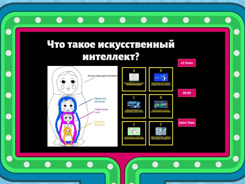 1) Что такое искусственный интеллект? a) Искусственный интеллект - это система, которая может полностью заменить человеческий мозг и выполнять все его функции. b) Искусственный интеллект - это программа, которая имитирует поведение человека и может общаться с ним на естественном языке. c) Искусственный интеллект - это набор алгоритмов, которые позволяют компьютеру обучаться самостоятельно. d) Искусственный интеллект - это технология, позволяющая компьютеру выполнять задачи, которые обычно требуют человеческого интеллекта. e) Искусственный интеллект – это широкая область, которая включает в себя множество различных методов и технологий для создания интеллектуальных систем. f) Искусственный интеллект - это средство создания разумных машин, которые могут заменить людей во всех сферах жизни. 2) Что такое нейросеть? a) Нейросеть - это способность компьютера понимать человеческие эмоции. b) Нейросеть - это функция автоматического исправления ошибок в программах. c) Нейросеть - это технология для выполнения задач, требующих человеческого интеллекта. d) Нейросеть - это тип искусственного интеллекта, который имитирует работу мозга и нервной системы живых организмов. Она состоит из множества узлов, связанных между собой, и используется для обработки информации и принятия решений. e) Нейросеть - это способ создания разумных машин для замены людей. f) Нейросеть - это программа, которая может общаться с человеком на естественном языке. 3) В чем разница между искусственным интеллектом и нейросетью? a) Основное различие между ИИ и НС заключается в том, что ИИ - это более широкий термин, который включает в себя различные методы и алгоритмы, а НС - это один из видов ИИ, основанный на моделировании биологических нейронов. b) Разница между ИИ и нейросетями заключается в том, что нейросети - это более продвинутый вид ИИ, который способен к самообучению и принятию решений на основе анализа больших объемов данных. c) ИИ и нейросети - это одно и то же, они используются для решения одних и тех же задач, но нейросети более эффективны в обработке больших объемов данных. d) ИИ используется для создания нейросетей, но нейросети не используются для создания ИИ. e) Нейросети могут быть использованы для создания ИИ, но ИИ не может быть использован для создания нейросетей. f) Нейросети - это только часть ИИ, они используются для обработки данных, но не могут принимать решения на основе этих данных.