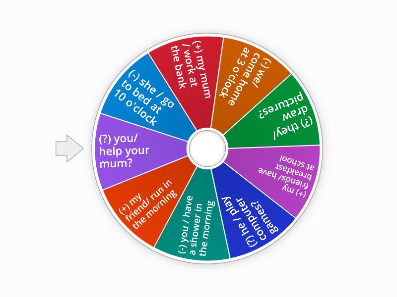 1) (-) she / go to bed at 10 o'clock 2) (+) my mum / work at the bank 3) (-) we/ come home at 3 o'clock 4) (?) they/ draw pictures? 5) (+) my friends/ have breakfast at school 6) (?) he / play computer games? 7) (-) you / have a shower in the morning 8) (+) my friend/ run in the morning 9) (?) you/ help your mum?