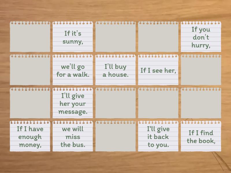 If it’s sunny, - we’ll go for a walk., If you don’t hurry, - we will miss the bus., If I have enough money, - I’ll buy a house., If I see her, - I’ll give her your message., If I find the book, - I'll give it back to you., If I get a role in the film, - I'll be famous., I’ll wash the dishes - if you cook the supper., If she studies harder, - she'll pass the exam., The hotel will be cheaper - if we book it now., You will learn more quickly - if you come to every class. ,