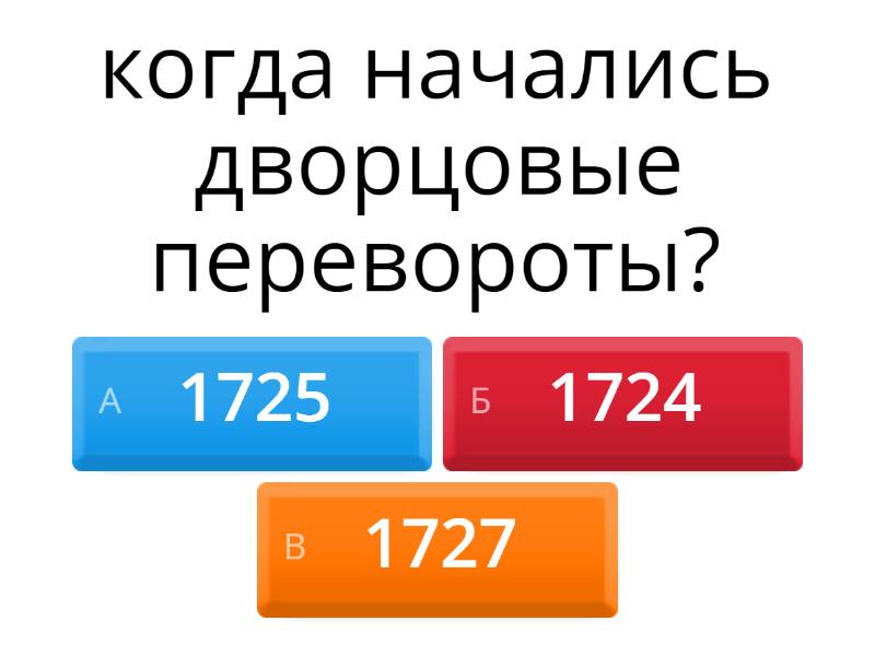 1) когда начались дворцовые перевороты? a) 1725 b) 1727 c) 1724 2) когда закончились дворцовые перевороты? a) 1764 b) 1762 c) 1763 3) сколько было правителей во время дворцовых переворотов? a) 5 b) 6 c) 7 4) какая причина дворцовых переворотов? a) распространение клеветы по отношению к правителям b) военные неудачи России c) внезапная смерть петра , который не успел указать наследника 5) Что было создано при Екатерине 1? a) Кабинет министров b) Верховный тайный совет c) Тайная канцелярия 6) Что было создано Анной Иоанновной? a) Кабинет министров b) Тайная канцелярия c) Верховный тайный совет 7) Кто был фаворитом Анны Иоанновны?  a) Миних b) Меншиков c) Бирон 8) сколько лет правила Елизавета Петровна? a) 19 b) 18 c) 20 9) Из-за какой болезни умер Петр 2 a) Чума b) Грипп c) Оспа 10) В какой войне Петр 3 подписал мирный договор a) Семилетняя война b) Северная война c) Полтавская битва