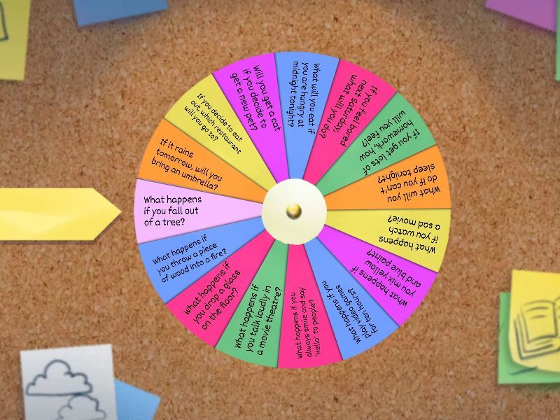 1) If it rains tomorrow, will you bring an umbrella? 2) If you decide to eat out, which restaurant will you go to? 3) Will you get a cat if you decide to get a new pet? 4) What will you eat if you are hungry at midnight tonight? 5) If you feel bored next Saturday, what will you do? 6) If you get lots of homework, how will you feel? 7) What will you do if you can't sleep tonight? 8) What happens if you watch a sad movie? 9) What happens if you mix yellow and blue paint? 10) What happens if you play video games for ten hours? 11) What happens if you always smile and say 'Hello' to people? 12) What happens if you talk loudly in a movie theatre? 13) What happens if you drop a glass on the floor? 14) What happens if you throw a piece of wood into a fire? 15) What happens if you fall out of a tree?