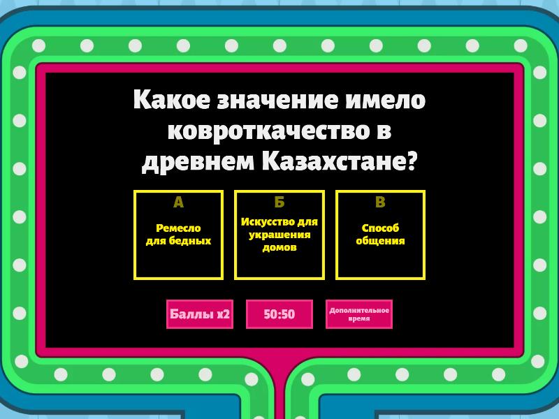 1) Какое значение имело ковроткачество в древнем Казахстане? a) Ремесло для бедных b) Искусство для украшения домов c) Способ общения 2) Какие основные материалы использовались в ковроткачестве? a) Хлопок и лен b) Шелк и синтетика c) Шерсть и шелк 3) Какой стиль ковров был популярен в средние века? a) Геометрические узоры b) Растительные мотивы c) Абстракция 4) В каком периоде использовали красный и синий цвета? a) Древний период b) Средние века c) Современность 5) Какой материал стал популярен в современности? a) Шелк b) Синтетика c) Шерсть 6) Какую роль играли геометрические узоры в древнем ковроткачестве? a) Символизировали религию b) Использовались для украшения c) Были частью языка 7) Какие цвета доминировали в средневековых коврах? a) Красный и синий b) Зеленый и золотой c) Черный и белый 8) Какие техники ткачества используются в современных коврах? a) Ручное плетение b) Машинное плетение c) Обе техники 9) Какой период характеризуется использованием абстрактных мотивов? a) Древний период b) Средние века c) Современность 10) Какие материалы были основными в древнем ковроткачестве? a) Хлопок и лен b) Шерсть и шелк c) Синтетика и хлопок