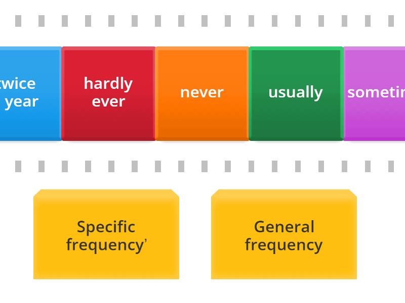 Specific frequency’: five times a week, four times a day, once a month, once a week, three times a month, twice a day, twice a year, General frequency: always, hardly ever, never, often, sometimes, usually,