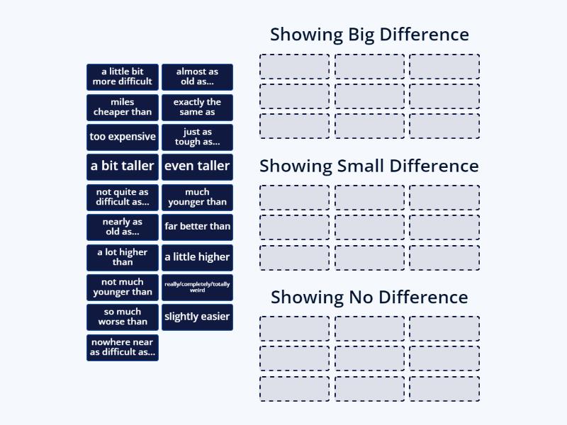 Showing Big Difference: much younger than, far better than, miles cheaper than, too expensive, a lot higher than, so much worse than, really/completely/totally weird, nowhere near as difficult as..., even taller, Showing Small Difference: slightly easier, a little higher, a little bit more difficult, a bit taller, not much younger than, almost as old as..., not quite as difficult as..., nearly as old as..., Showing No Difference: exactly the same as, just as tough as...,