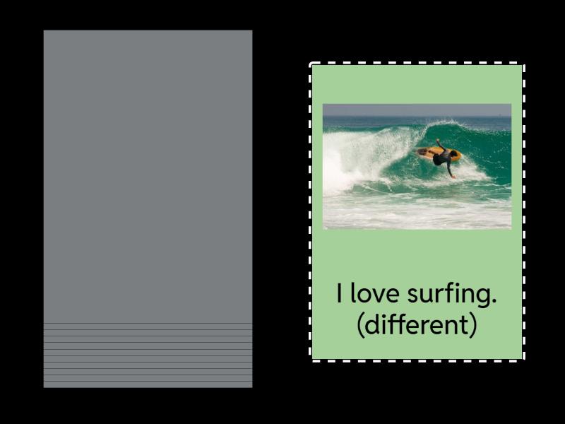 : I love surfing. (different), I have never been snowboarding. (different), I'm not going to school tomorrow. (the same), I live in St Petersburg. (different), I went on holiday in January. (the same), I don't like tea. (different), I won't be late. (the same), I can't play chess. (the same), I would like to go to the USA. (the same), I'm really into music. (different), I'm not quite keen on going to the cinema. (the same), I have never been to Turkey. (the same),