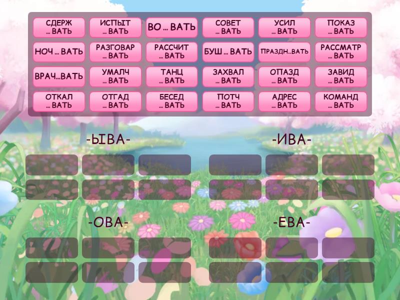 -ЫВА-: ОПАЗД ... ВАТЬ, ОТГАД ... ВАТЬ, ОТКАЛ ... ВАТЬ, ПОКАЗ ... ВАТЬ, ИСПЫТ ... ВАТЬ, РАССЧИТ ... ВАТЬ, -ИВА-: ЗАХВАЛ ... ВАТЬ, УМАЛЧ ... ВАТЬ , РАССМАТР ... ВАТЬ, РАЗГОВАР ... ВАТЬ, УСИЛ ... ВАТЬ, СДЕРЖ ... ВАТЬ, -ОВА-: КОМАНД ... ВАТЬ, АДРЕС ... ВАТЬ, ЗАВИД ... ВАТЬ, СОВЕТ ... ВАТЬ, БЕСЕД ... ВАТЬ, ПРАЗДН...ВАТЬ, -ЕВА-: ТАНЦ ... ВАТЬ, НОЧ ... ВАТЬ, БУШ ... ВАТЬ, ВО ... ВАТЬ, ПОТЧ ... ВАТЬ, ВРАЧ...ВАТЬ,