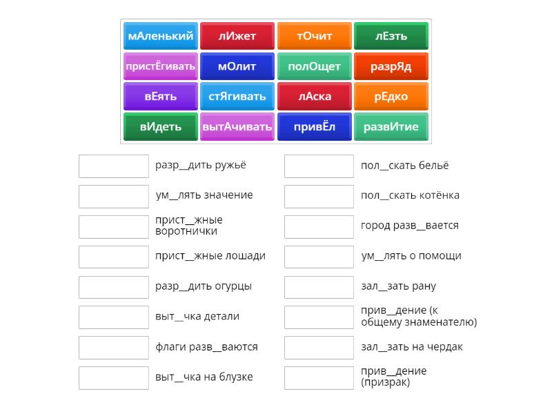 вЕять - флаги разв__ваются, развИтие - город разв__вается, лАска - пол__скать котёнка, полОщет - пол__скать бельё, лИжет - зал__зать рану, лЕзть - зал__зать на чердак, мАленький - ум__лять значение, мОлит - ум__лять о помощи, рЕдко - разр__дить огурцы, разрЯд - разр__дить ружьё, вытАчивать - выт__чка на блузке, тОчит - выт__чка детали, стЯгивать - прист__жные лошади, пристЁгивать - прист__жные воротнички, вИдеть - прив__дение (призрак), привЁл - прив__дение (к общему знаменателю),