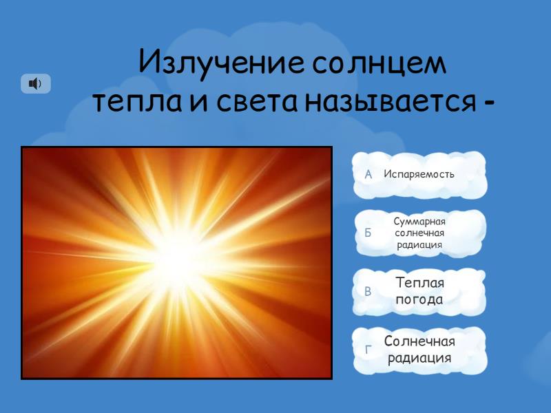 1) Излучение солнцем тепла и света называется - a) Испаряемость b) Суммарная солнечная радиация c) Теплая погода d) Солнечная радиация 2) В каких из перечисленных климатических поясах расположена территория России? a) Антарктический b) Умеренный c) Субумеренный d) Арктический e) Субэкваториальный f) Субарктический 3) Вихрь с низким давлением в центре. a) Циклон b) Атмосферный фронт c) Антициклон d) Вихрь 4) Общее количество тепла и света, достигающее поверхности Земли a) Суммарная солнечная радиация b) Солнечная радиация c) Распределение солнечной радиации d) Азиатский максимум 5) Отношение годовой суммы осадков к испаряемости за этот же период a) Возможное испарение b) Коэффициент увлажнения c) Увлажнение d) Испарение 6) Климатический пояс покрывающий территорию островов Северного Ледовитого океана и его Сибирское побережье. a) Субарктический b) Арктический c) Умеренный d) Азиатский  7) Сколько климатических областей выделяется в пределах субарктического пояса на территории России? a) 4 b) Не выделяются области  c) 3 d) 2 8) Агроклиматология - это a) Наука, изучающая климат над сельскохозяйственными объектами. b) Учет агроклиматических ресурсов. c) Наука, изучающая климат как фактор сельскохозяйственного производства. 9) Сильные и продолжительные ветры выдувающие верхний слой почвы. a) Пыльные бури b) Ураган c) Засуха d) Песчаные бури