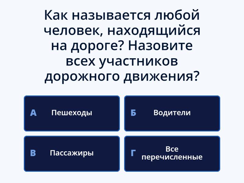 1) Как называется любой человек, находящийся на дороге? Назовите всех участников дорожного движения? a) Пешеходы b) Водители c) Пассажиры d) Все перечисленные 2) Какого сигнала нет у пешеходного сфетофора? a) Красного b) Желтого c) Зеленого 3) Где останавливается пассажирский транспорт? a) На остановке b) На дороге c) У обочины 4) С какого возраста ребенок разрешается правилами дорожного движения ездить на велосипеде по улицам города? a) Разрешается с 12 лет b) Разрешается с 10 лет c) разрешается с 14 лет 5) Сколько сигналов имеет пешеходный светофор? a) 1 b) 2 c) 3 d) 4 6) Какое положение регулировщика запрещает движение всем участникам движения? a) Рука поднята вверх b) Рука смотрит вперед c) Рука смотрит вправо d) Рука смотрит влево 7) Что означает термин «дорога»? a) полоса земли, отведенная для движения транспортных средств и пешеходов; b) полоса земли, имеющая дорожное покрытие; c) полоса земли либо поверхность искусственного сооружения, обустроенная или приспособленная и используемая для движения транспортных средств, включающая в себя проезжие части, трамвайные пути, тротуары, обочины и разделительные полосы. 8) Что такое «перекресток»? a) пересечение дороги с железнодорожными путями; b) пересечение двух дорог; c) место пересечения, примыкания или разветвления дорог на одном уровне, ограниченное воображаемыми линиями, соединяющими соответственно противоположные, наиболее удаленные от центра перекрестка начала закруглений проезжих частей. 9) Какую из санкций имеет право применить инспектор ГИБДД к велосипедисту-нарушителю? a) применить любую из этих санкций. b) оштрафовать нарушителя; c) предупредить нарушителя; 10) Пешеход переходит дорогу в неположенном месте. Сотрудник ГИБДД имеет право a) оштрафовать и предупредить его; b) арестовать нарушителя. c) оштрафовать нарушителя; 11) Предупреждающие знаки имеют форму и цвет: a) треугольные с красной окантовкой; b) круглые с красной окантовкой; c) квадраты с синим фоном. 12) Запрещающие знаки имеют форму и цвет: a) круглые с синим фоном; b) треугольники с красной окантовкой; c) круглые с красной окантовкой. 13) Разрешается ли движение пешеходов по велосипедной дорожке? a) разрешается во всех случаях; b) не разрешается; c) разрешается, не затрудняя движение велосипедистов, если нет пешеходной дорожки или тротуара. 14) Что показано в Правилах о переходе дороги, если приближается автомобиль с проблесковым маячком или специальным сигналом? a) можно переходить дорогу, не мешая этому автомобилю; b) воздержитесь от выхода на проезжую часть; c) как можно быстрее перейти проезжую часть. 15) Что должны, по возможности, предпринять пешеходы при движении по загородной дороге в темное время суток и в условиях недостаточной видимости? a) идти, по возможности придерживаясь правой стороны, по ходу движения ТС (транспортного средства); b) идти навстречу движения ТС, надеть яркую нарукавную повязку или прикрепить к своей одежде световозвращающие элементы; c) идти, придерживаясь правой стороны и освещая дорогу фонариком. 16) Какие меры предосторожности должен принять пешеход, начиная переход дороги между стоящими автомобилями? a) убедиться, что нет приближающихся слева и справа транспортных средств; b) переходить дорогу медленно; c) переходить дорогу быстрее 17) Имеет ли право пешеход переходить дорогу, если в основном светофоре включен зеленый сигнал, 