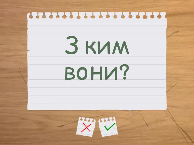 Про що ти говориш? - What are you talking about?, На кого ти чекаєш? - Who are you waiting for?, З ким ти йдеш? - Who are you going with?, З ким вони? - Who are they with?, Над чим ти працюєш? - What are you working on?, Про яку проблему вони говорять? - Which problem are they talking about?, Що вона шукає? - What is she looking for?, З ким ти їздив у відпустку? - Who did you go on holiday with?, Від чого це залежить? - What does it depend on?, Від кого це ? - Who is it from?,