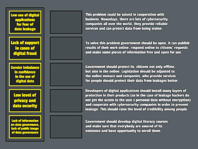 Gender imbalance in confidence in the use of digital data - Government should develop digital literacy courses and make sure that everybody are awared of its existence and have opportunity to enroll them., Low level of privacy and data security - This problem could be solved in cooperation with business. Nowadays, there are lots of cybersecurity companies all over the world, they provide reliable services and can protect data from being stolen., Lack of information on data governance, lack of public image of data governance - To solve this problem government should be open, it can publish results of their work online, respond online to citizens' requests and make some pieces of information free and open for use., Lack of support in cases of digital fraud - Government should protect its’ citizens not only offline, but also in the online. Legislation should be adjusted to the online menace and companies, who provide services for people should protect their data from leakages better., Low use of digital applications for fear of data leakage - Developers of digital applications should install many layers of protection in their products (so in the case of leakage hackers do not get the access to the user’s personal data without encryption) and cooperate with cybersecurity companies in order to prevent leakage. This should raise the level of credibility among people.,
