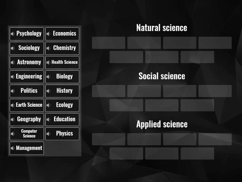 Natural science: Biology, Chemistry, Physics, Earth Science, Geography, Ecology, Astronomy, Social science: Psychology, Education, History, Politics, Sociology, Applied science: Economics, Engineering, Management, Computer Science, Health Science,