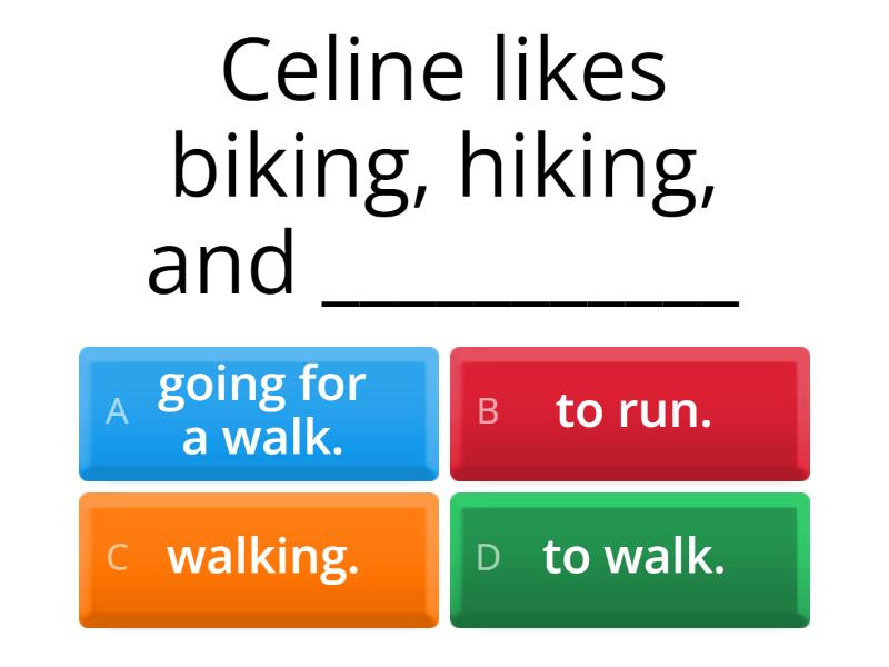 1) Celine likes biking, hiking, and ___________ a) going for a walk. b) to run. c) walking. d) to walk. 2) She likes to swim, sleep, and __________ a) running. b) to sprint. c) read. d) exercising. 3) The student brushed their teeth, packed their bag, and ____________ a) catching the bus. b) caught the bus. c) catch the bus. d) catches the bus. 4) Terry has intelligence, honesty, and _______________ a) funny. b) is funny. c) is humorous. d) humor. 5) Lucy is not only a loving character, but she is a strong character as well. a) No change b) character but she is a strong character as well. c) character, but she is also a strong character. d) character but also a strong character. 6) Clara not only wants money, but also fame. a) Parallel b) Faulty (not parallel) 7) I love singing more than drawing. a) Parallel b) Faulty (not parallel) 8) She’s cute, intelligent, and knows a lot of good jokes. a) Parallel b) Faulty (not parallel) 9) I will meet you either at the movie or see you later at the party. a) Parallel b) Faulty (not parallel) 10) Which one is parallel? a) Not only is this car expensive but also not safe. b) Not only is this car expensive but it is also unsafe. 11) Which one is parallel? a) The trip to Boise is neither short nor inexpensive. b) The trip to Boise is neither a short one or inexpensive. 12) Which one is parallel? a) To love is losing control. b) To love is to lose control. 13) To succeed is opening a new opportunity. a) Parallel b) Faulty (not parallel) 14) You are either for us or against us. a) Parallel b) Faulty (not parallel) 15) Which one is parallel? a) I finished my homework and submit it online. b) I finished my homework and submitted it online.