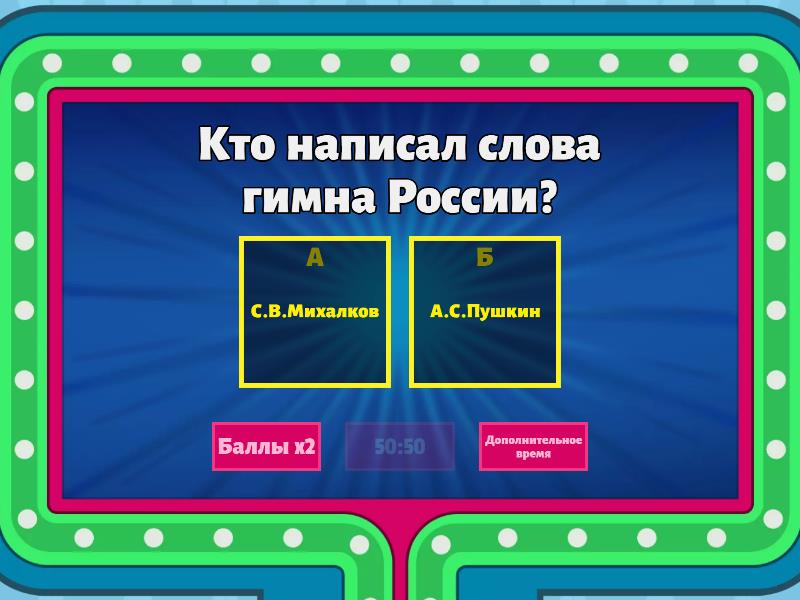1) Кто написал слова гимна России? a) С.В.Михалков b) А.С.Пушкин 2) Кто композитор гимна? a) П.И.Чайковский b) А.В.Александров 3) С какого года отмечается День России? a) 1992 b) 1990 4) сколько корон у орлов на гербе России? a) 5 b) 3 5) Как наша Родина называлась в древности? a) Русь b) русское государство