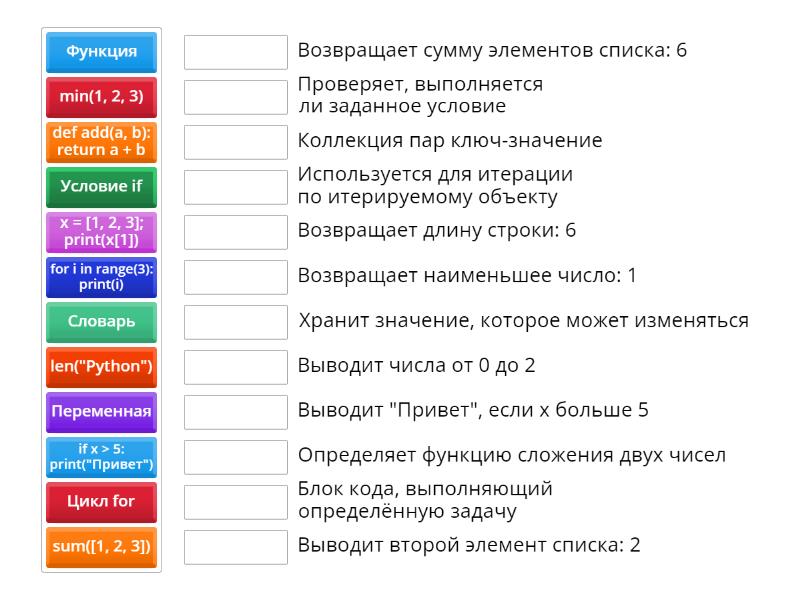 Переменная - Хранит значение, которое может изменяться, Цикл for - Используется для итерации по итерируемому объекту, Условие if - Проверяет, выполняется ли заданное условие, Функция - Блок кода, выполняющий определённую задачу, Словарь - Коллекция пар ключ-значение, for i in range(3): print(i) - Выводит числа от 0 до 2, if x > 5: print("Привет") - Выводит "Привет", если x больше 5, x = [1, 2, 3]; print(x[1]) - Выводит второй элемент списка: 2, def add(a, b): return a + b - Определяет функцию сложения двух чисел, len("Python") - Возвращает длину строки: 6, sum([1, 2, 3]) - Возвращает сумму элементов списка: 6, min(1, 2, 3) - Возвращает наименьшее число: 1,