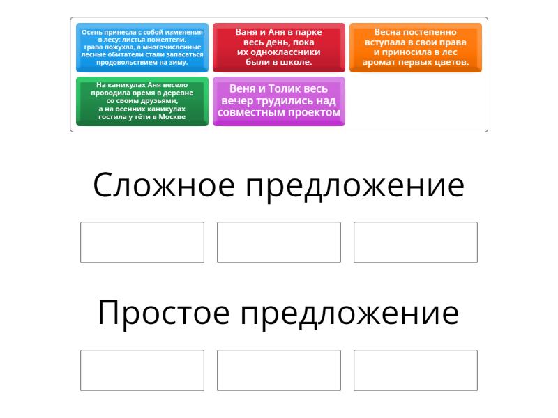 Сложное предложение : Ваня и Аня в парке весь день, пока их одноклассники были в школе., Осень принесла с собой изменения в лесу: листья пожелтели, трава пожухла, а многочисленные лесные обитатели стали запасаться продовольствием на зиму., Простое предложение : На каникулах Аня весело проводила время в деревне со своим друзьями, а на осенних каникулах гостила у тёти в Москве , Веня и Толик весь вечер трудились над совместным проектом, Весна постепенно вступала в свои права и приносила в лес аромат первых цветов.,