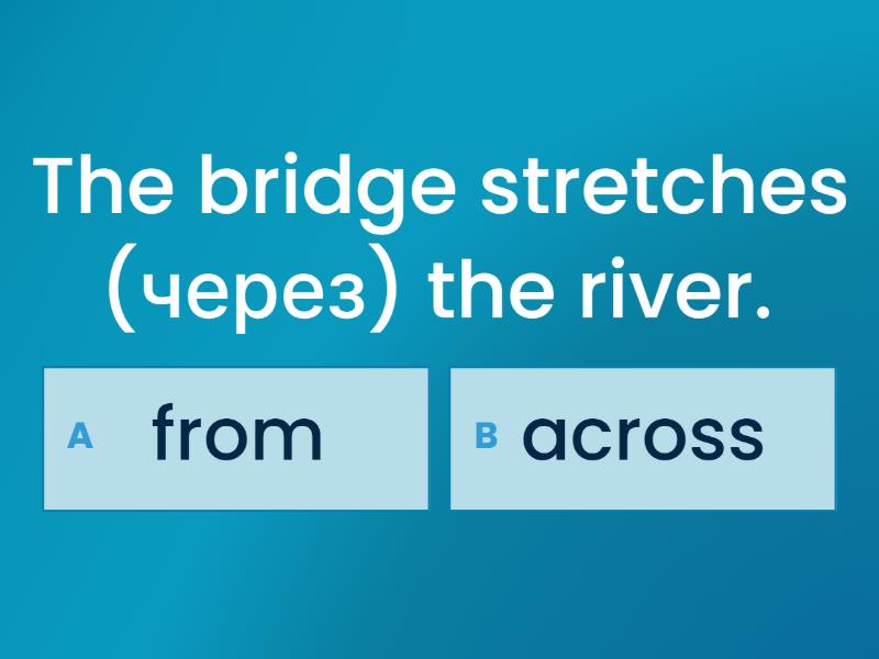1) The bridge stretches (через) the river. a) from b) across 2) We drove (через) the tunnel to reach the city. a) through b) across 3) He looked (через) the window to see what was happening outside. a) into b) through 4) They walked (вокруг) the park to enjoy the view. a) along b) round 5) We strolled (вдоль) the beach, enjoying the sunset. a) along b) towards 6) She went (в направлении-конечная точка) the store to buy groceries. a) to b) towards 7) He dived (*внутрь* куда?)the pool with a big splash. a) into b) out of 8) She poured the juice (*внутрь* куда?) the glass carefully. a) in b) into 9) The cat jumped (*изнутри*) the box and ran away. a) from b) out of 10) He pulled his wallet (*изнутри*) his pocket to pay for the meal. a) from b) out of 11) They moved (в направлении*не конечная точка) the exit as the event ended. a) to b) towards 12) She walked (в направлении*не конечная точка) the bench to sit and rest. a) towards b) to 13) The package was delivered (из) overseas. a) from b) out of 14) He borrowed a book (из) the library. a) out of b) from 15) I found him (в*где?*) the hall a) into b) in