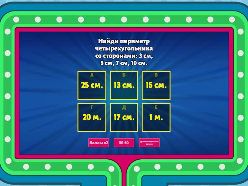 1) Найди периметр четырехугольника со сторонами: 3 см, 5 см, 7 см, 10 см. a) 25 см. b) 13 см. c) 15 см. d) 20 м. e) 17 см. f) 1 м. 2) Вспомни правило. Периметр многоугольника - ... a) произведение длин всех его сторон. b) разность длин всех его сторон. c) сумма длин всех его сторон. d) сумма двух длин его сторон. e) разность двух длин его сторон. 3) Сторона квадрата 2 см. Вычисли периметр этого квадрата. a) 4 см. b) 6 см. c) 8 см. d) 12 см. e) 10 см. f) 8 м. 4) Огород имеет прямоугольную форму. Его длина 10 м , а ширина 5 м . Какова будет длина забора? (ПОМНИ! Длина забора будет равна периметру огорода). a) 30 м. b) 20 м. c) 10 м. d) 50 м. e) 5 м. f) 17 м. 5) Одна сторона треугольника 5 см, вторая – 3 см, а третья на 4 см больше , чем вторая. Вычисли периметр треугольника. a) 17 см. b) 21 см. c) 19 см. d) 5 см. e) 10 см. f) 15 см.