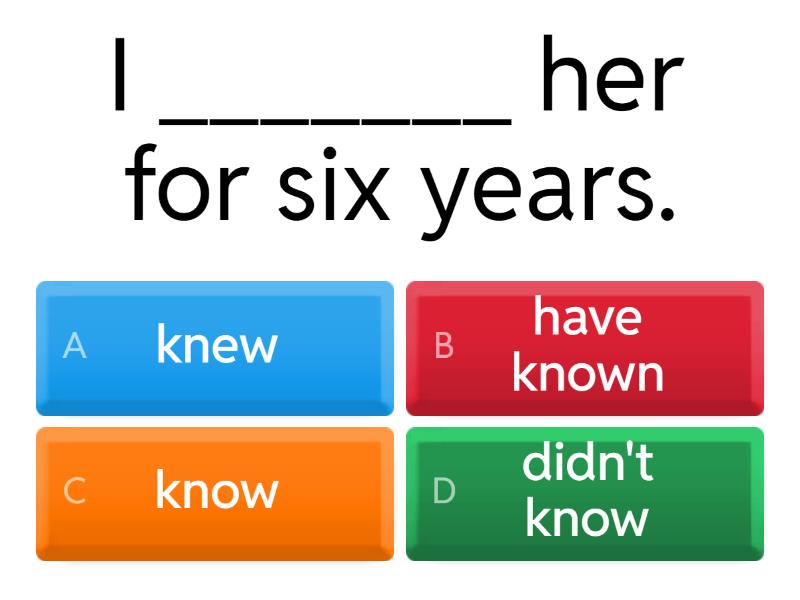 1) I _______ her for six years. a) knew b) have known c) know d) didn't know 2) I _______ Pete last night. a) didn't see b) seen c) have seen d) have not seen 3) He _______ in Paris from 1997 to 2000. a) have lived b) have not lived c) lived d) lives 4) They ________ some postcards. a) have just bought b) have just buyed c) just bought d) just buy 5) I'm really hungry. I ________ since last night. a) has eaten b) ate c) didn't eat d) have not eaten 6) We _________ a taxi to town that morning. a) have not taken b) took c) take d) have taken 7) I ______ my job three times this year. a) changed b) changes c) have changed d) did not change 8) A car came round the corner and I ______ out of the way. a) jumped b) was jumped c) have not jumped d) have jumped 9) I ______ to Paris. a) have was b) did not been c) was d) have been 10) Tom Hanks ______ an Oscar several times already. a) won b) has won c) has winnen d) did not win 11) Look! I _____ new shoes! a) have bought b) bought c) did bought d) have been bought 12) Hmmm...What a smell! She ____just_____dinner! a) have made b) has made c) made d) is making 13) She ____home and put her boots off. a) came b) comes c) has come d) have came 14) When I ____the door, she was doing homework. a) opened b) has opened c) have open d) was opening
