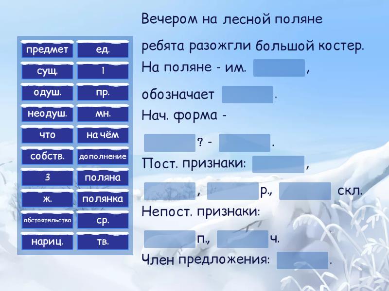 Вечером на лесной поляне ребята разожгли большой костер. На поляне - им. ____, обозначает ____. Нач. форма - ____? - ____. Пост. признаки: ____, ____, ____р., ____ скл. Непост. признаки: ____п., ____ч. Член предложения: ____. Саша подошёл к клетке с кроликами, бросил им капустных листьев. С кроликами - им. сущ., обозначает ____. Нач. форма - ____? - ____. Пост. признаки: ____, ____, ____р., ____ скл. Непост. признаки: ____п., ____ч. Член предложения: ____. Каштанка вскочила и бросилась на гуся. Каштанка - им. сущ., обозначает ____. Нач. форма - ____? - ____. Пост. признаки: ____, ____, ____р., ____ скл. Непост. признаки: ____п., ____ч. Член предложения: ____.