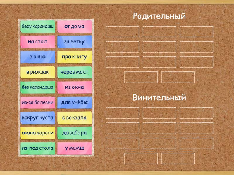 Родительный: без карандаша, у мамы, от дома, до забора, из окна, около дороги, с вокзала, для учёбы, из-за болезни, вокруг куста, из-под стола, Винительный: в окно, за ветку, на стол, про книгу, через мост , беру карандаш, в рюкзак ,