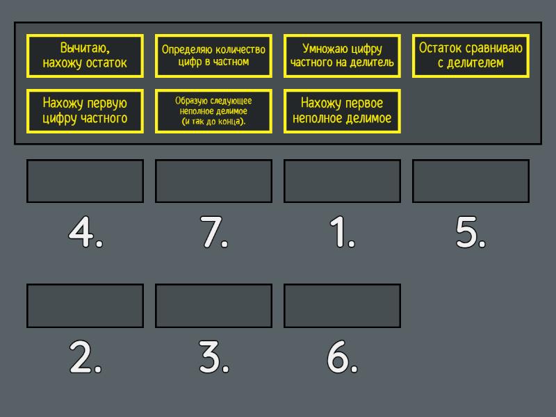 Нахожу первое неполное делимое - 1., Определяю количество цифр в частном - 2., Нахожу первую цифру частного - 3., Умножаю цифру частного на делитель - 4., Вычитаю, нахожу остаток - 5., Остаток сравниваю с делителем - 6., Образую следующее неполное делимое (и так до конца). - 7.,